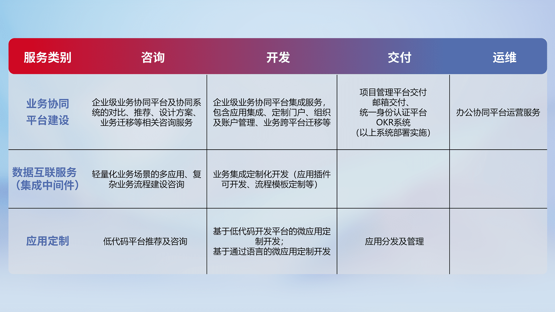 针对钉钉、、企微、、IDaas等平台级产品提供产品的规划、、、、方案、、、交付、、定制化开发等服务,,,实现如统一协同办公、、智能客户服务、、、混合会议管理、、、、智能数据查询、、、、等业务场景,,,,实现数字化转型。。。